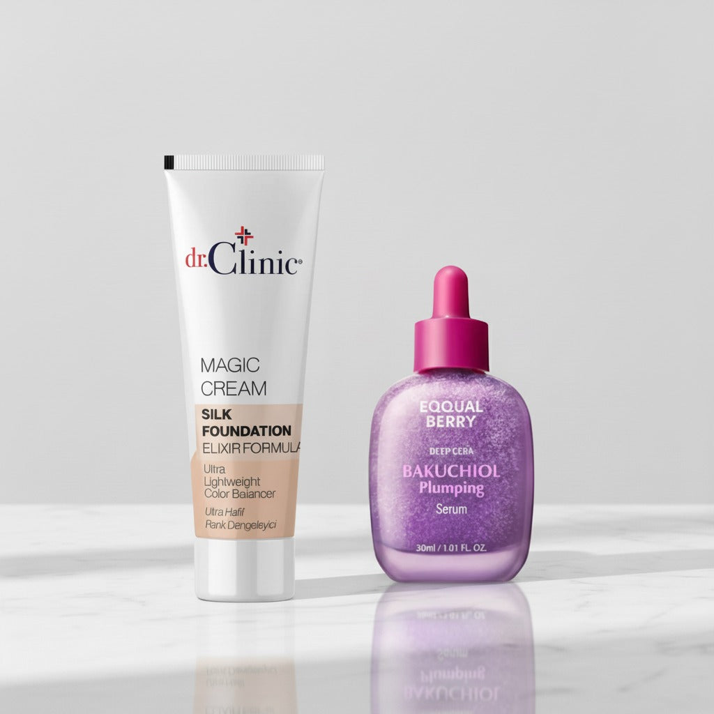 The Magic Glow Package combines Dr. Clinic Magic Cream Silk Foundation for skin tone correction and a smooth, silky finish, with Equal Berry Bakuchiol Plumping Serum to deeply hydrate the skin and enhance its natural plumpness and radiance.